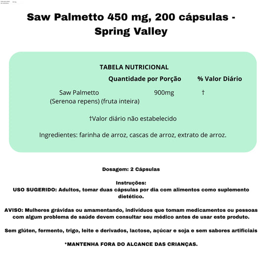 Saw Palmetto 450 mg, 200 cápsulas - Spring Valley