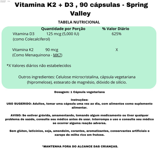 Vitamina K2 + D3 , 90 cápsulas - Spring Valley