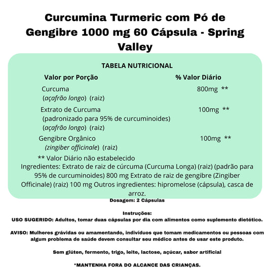 Curcumina Turmeric com Pó de Gengibre 1000 mg 60 Cápsula - Spring Valley