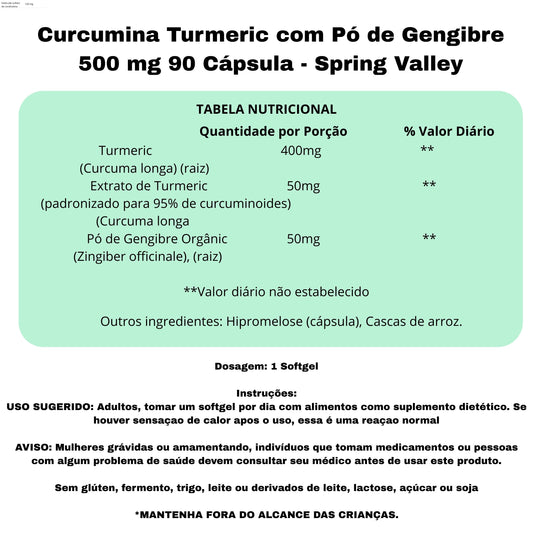 Curcumina Turmeric com Pó de Gengibre 500 mg 90 Cápsula - Spring Valley