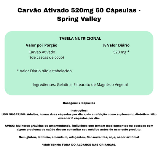Carvão Ativado 520mg 60 Cápsulas - Spring Valley