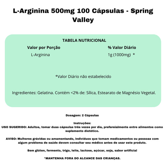 L-Arginina 500mg 100 Cápsulas - Spring Valley