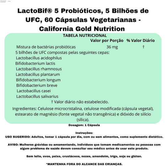 LactoBif® 5 Probióticos, 5 Bilhões de UFC, 60 Cápsulas Vegetarianas - California Gold Nutrition